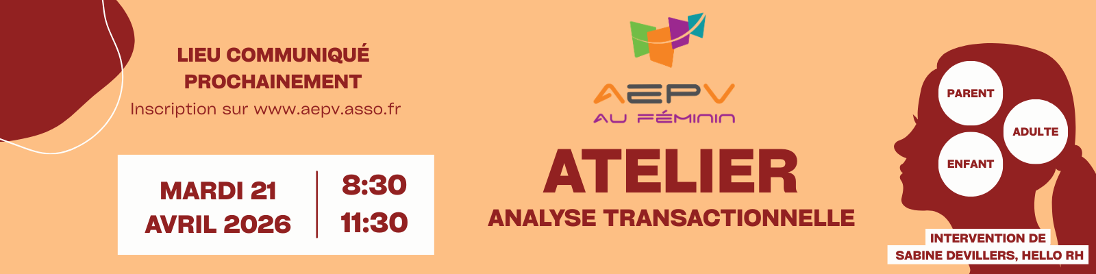 L'AEPV au féminin vous propose une matinée riche en échanges et partages entre femmes, le mardi 21 avril 2026 de 8h30 à 11h30, lieu communiqué prochainement.